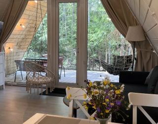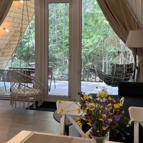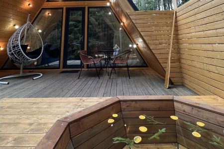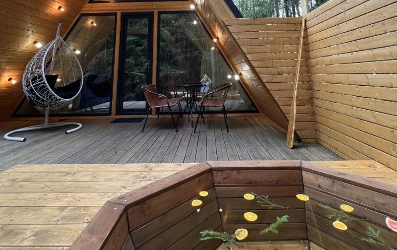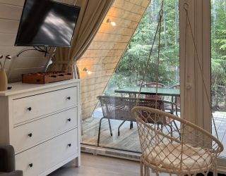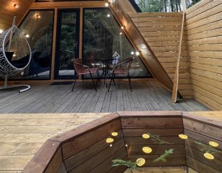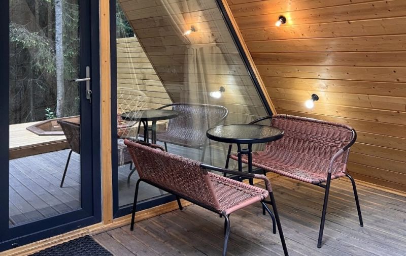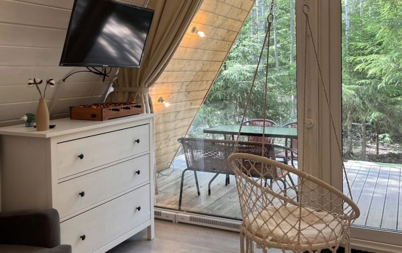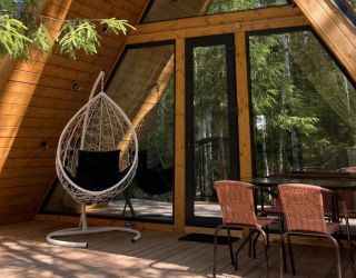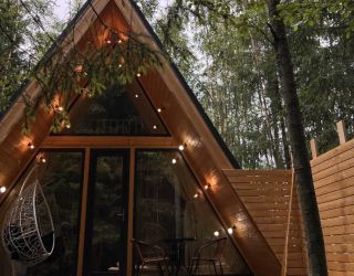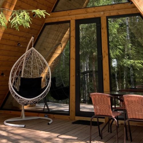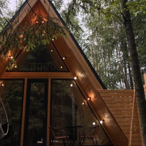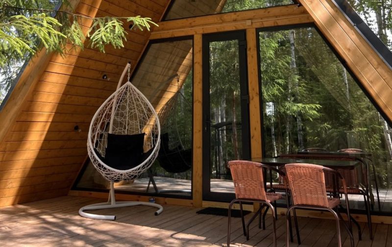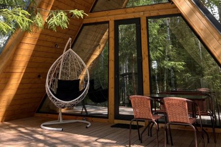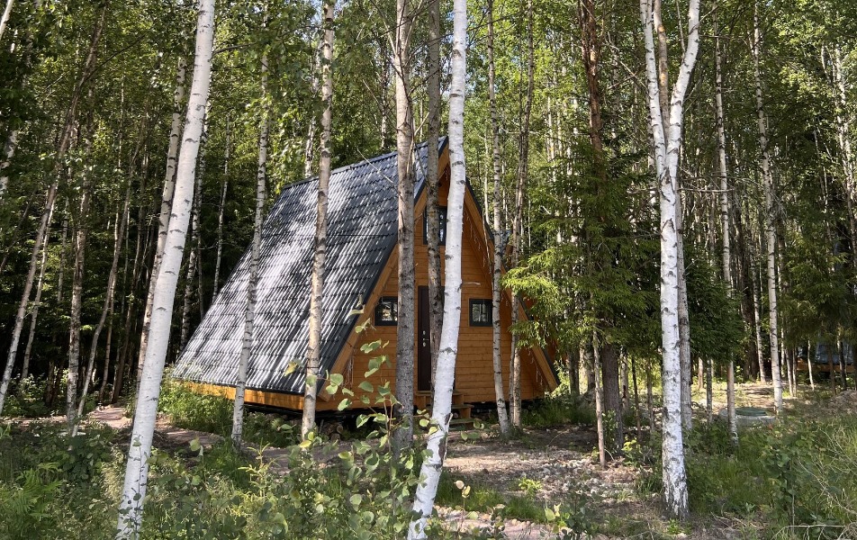 В 40 километрах от Санкт-Петербурга, в поселке Хиттолоярви, расположились комфортабельные коттеджи. Восемь домов в стиле A-frame, вместимостью от двух до четырех человек, оборудованы собственными террасами с мангалами и зонами для отдыха. Из окон, открывающих вид на лес, можно любоваться живописной природой.